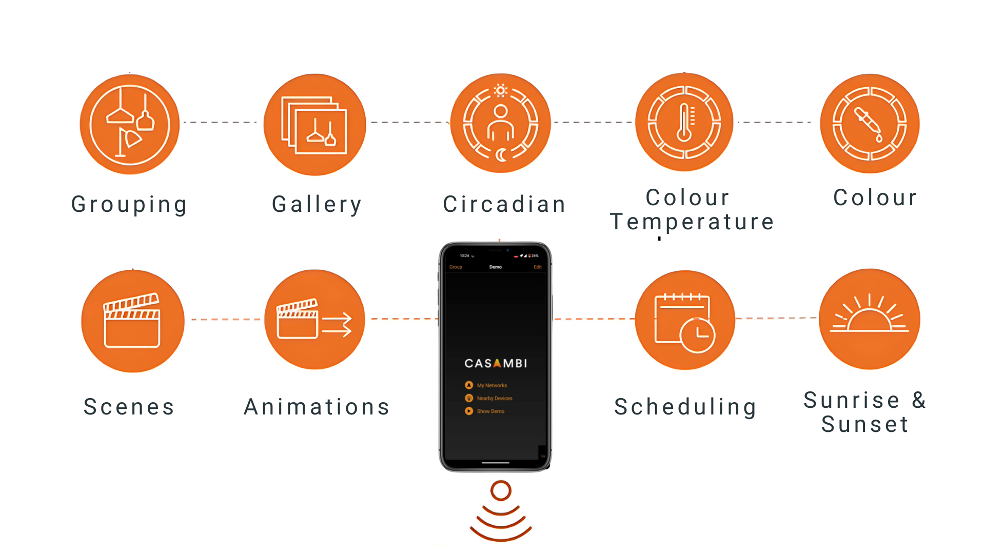 Casambi products use bluetooth technology to create wirelessly connected lighting systems that can be programmed and controlled by a smart device from anywhere in the world.