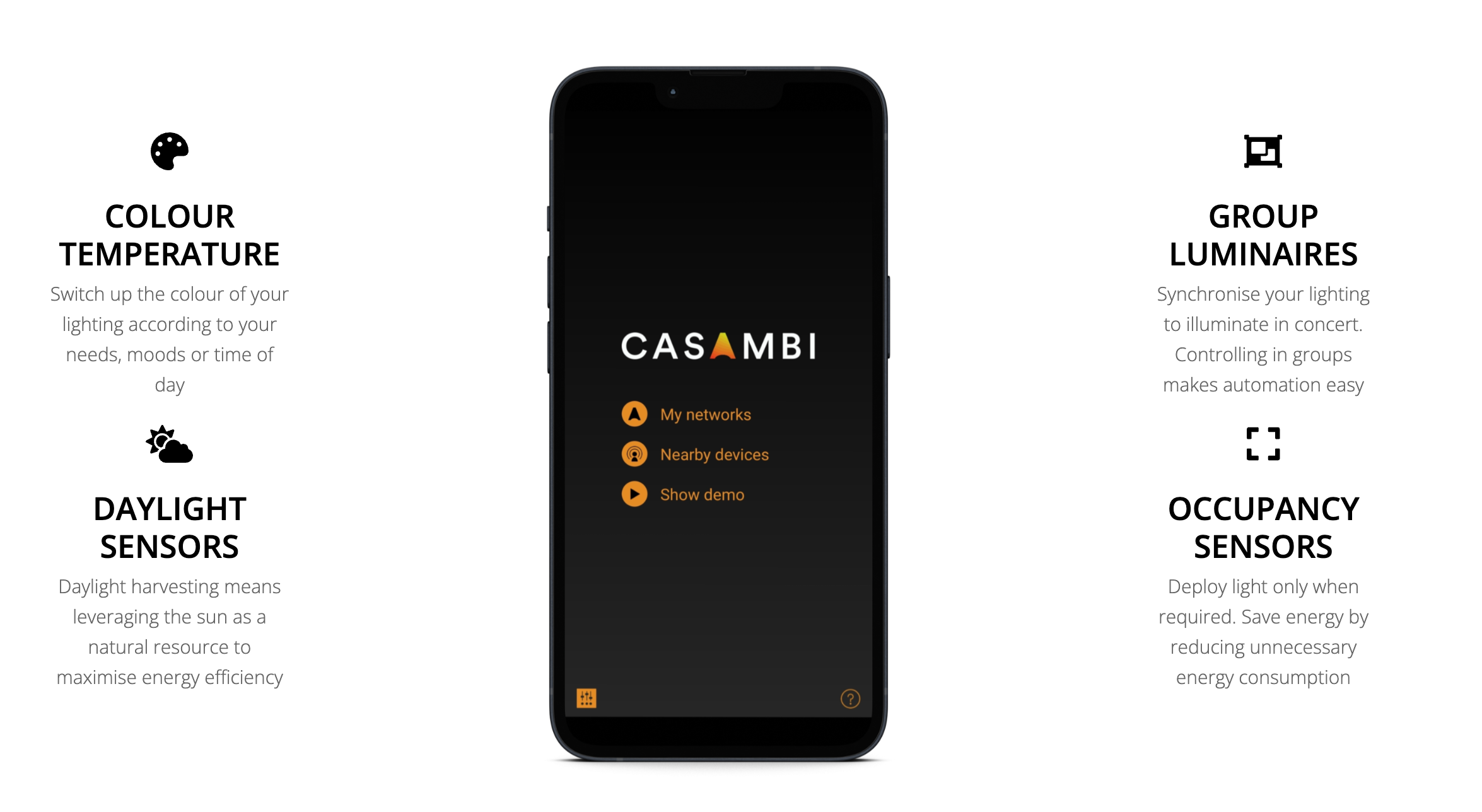 Casambi systems are accessed using an intuitive, user friendly app which allows you to easily control lighting systems from your smart device.